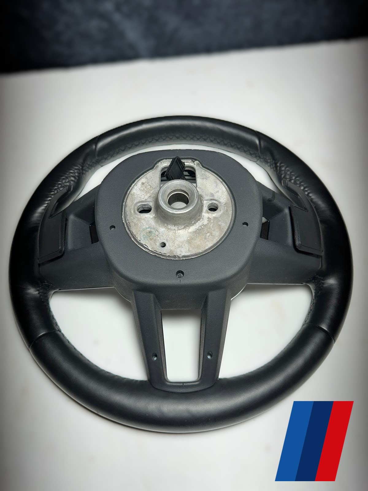 - Design M Sport: Prezintă logo-ul M discret în partea inferioară a ornamentului central și cusături pe volan (deși culoarea cusăturilor nu este specificată ca fiind tricoloră, este standard pentru pachetul M Sport).