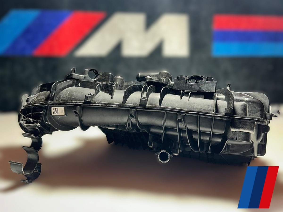 Galerie de admisie originală BMW, care integrează și un intercooler (răcitor de aer de supraalimentare), o componentă esențială pentru motoarele pe benzină de 2.0 litri din seria B48.