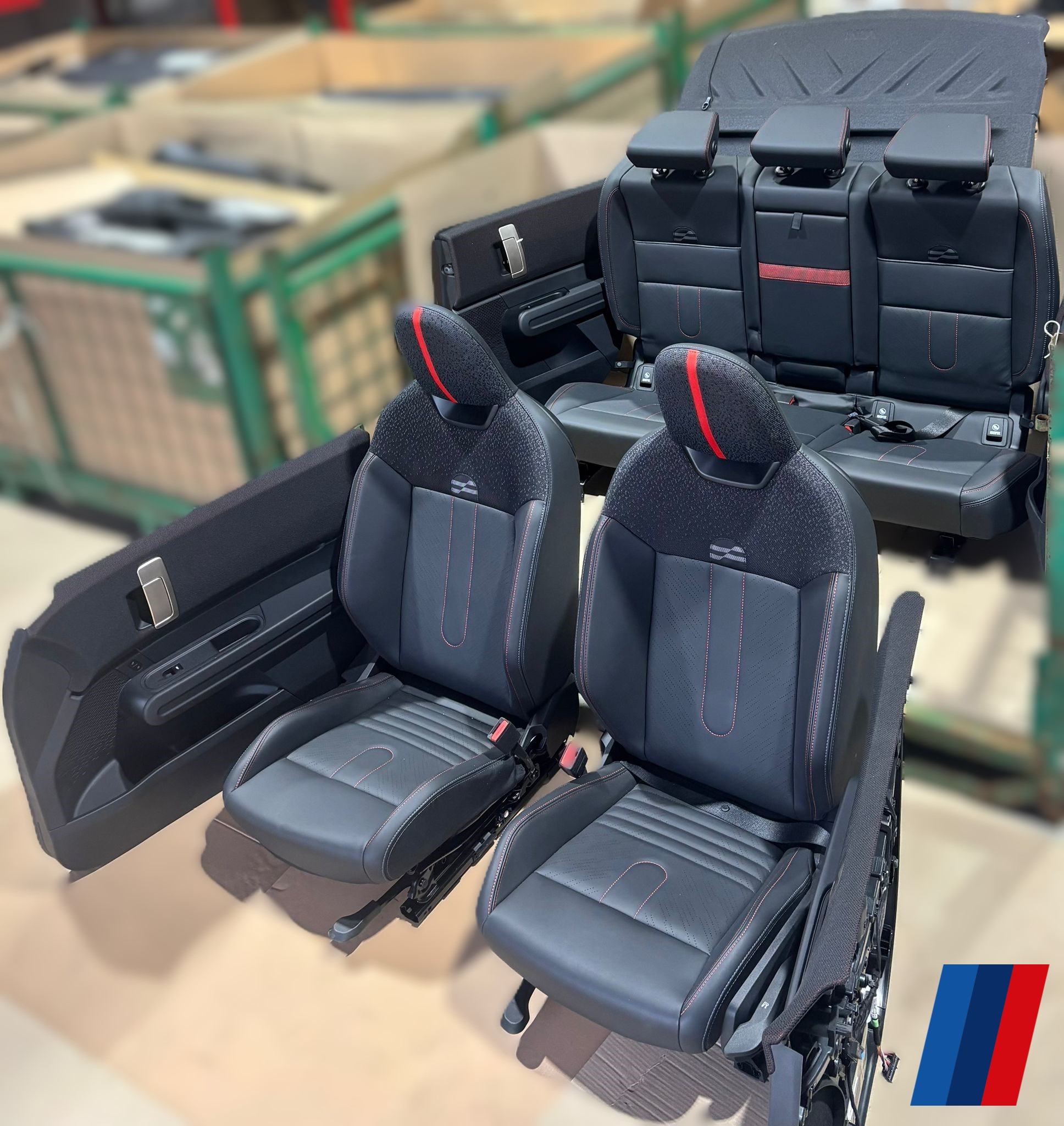 • Design Sport: Scaune față sport ergonomice, cu susținere laterală superioară și bandă decorativă roșie pe tetiere.
